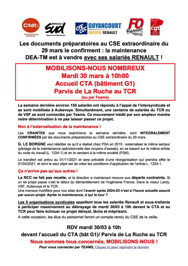 La CGT avec SUD, la CFE-CGC, la CFDT et FO appelle les salariés d'Aubevoye et de Guyancourt à une mobilisation mardi 30 mars à 10h00